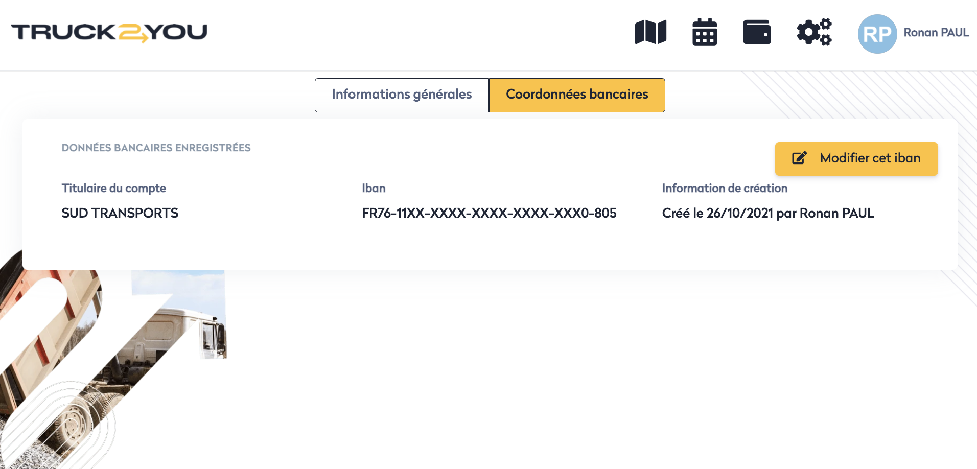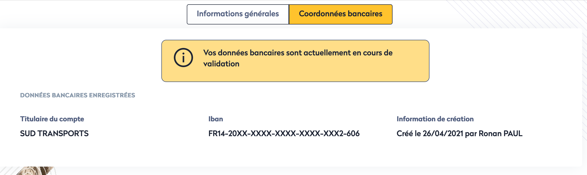 Vous pouvez vérifier vos coordonnées bancaires à tout moment dans l'onglet "Coordonnées bancaires" de la page "Ma société".