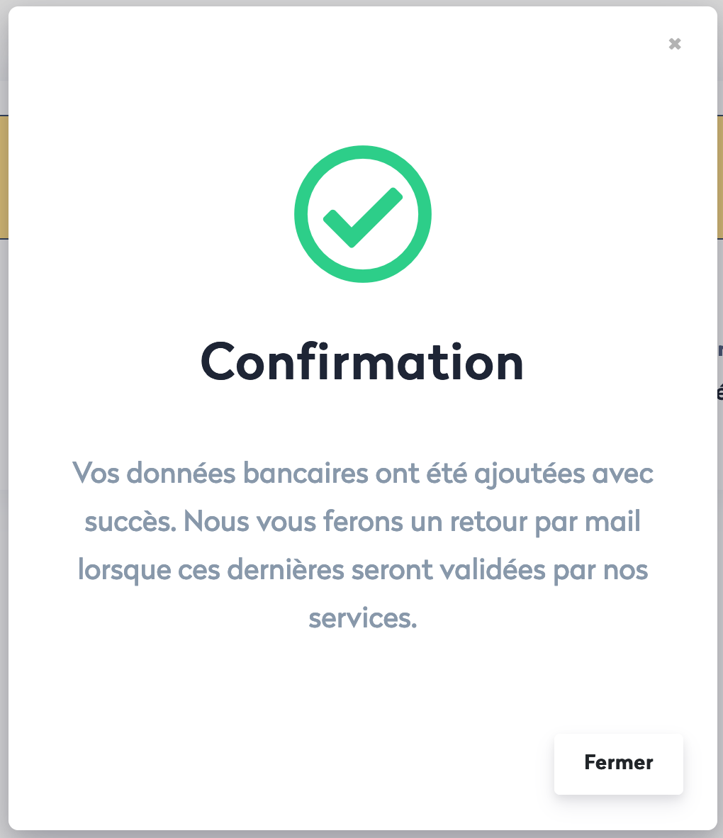 Voici l'affichage lorsque vos coordonnées bancaires sont en cours de validation :