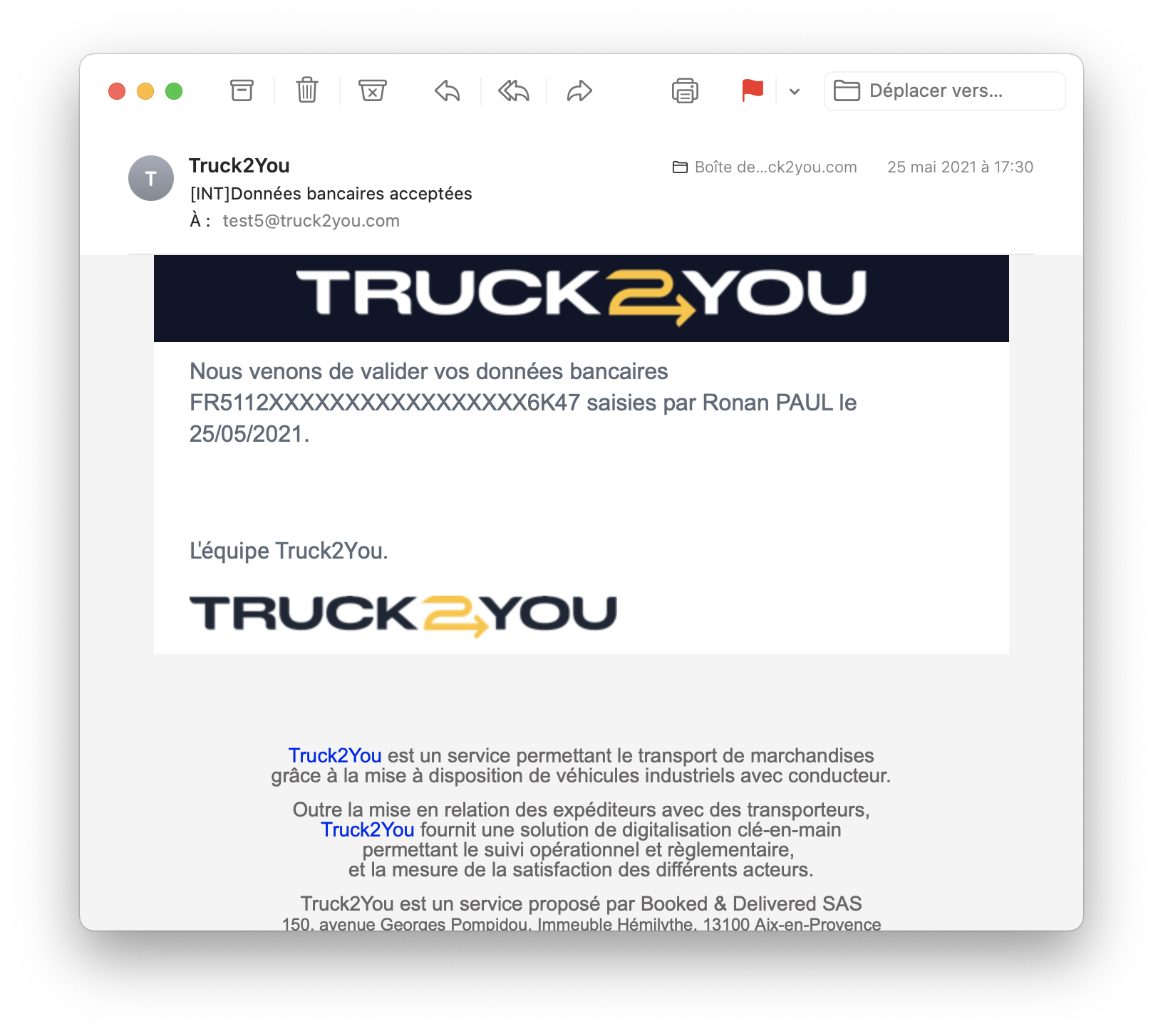 Lorsque vos coordonnées bancaires sont validées, vous recevrez un e-mail de validation :