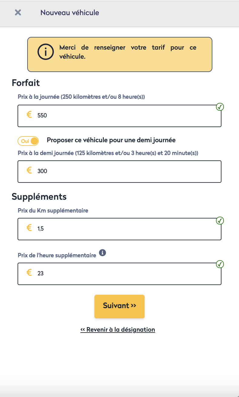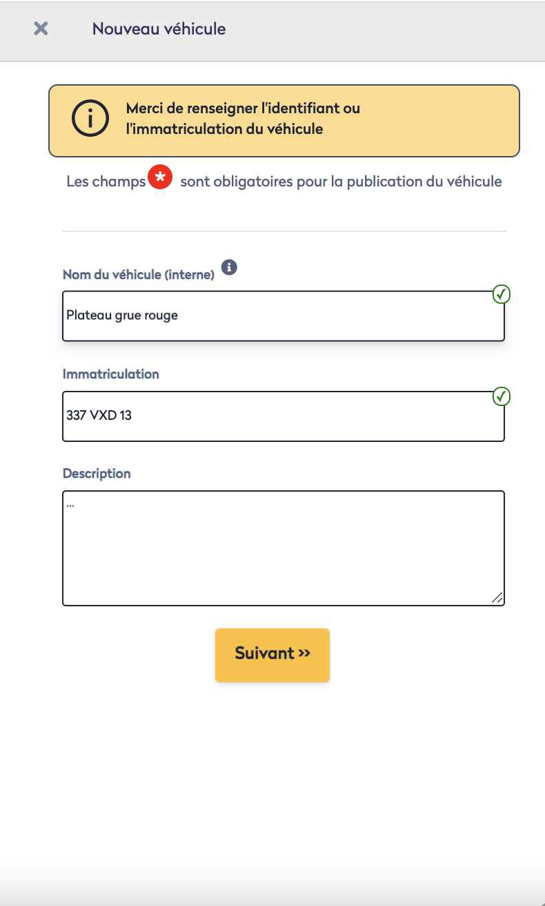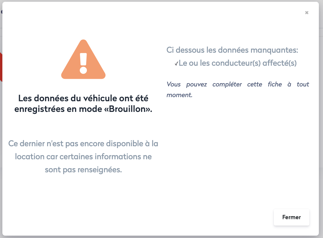 Si votre saisie est incomplète, le véhicule sera ajouté en mode brouillon : il ne sera proposé dans vos offres tant qu'il n'aura pas été complété.