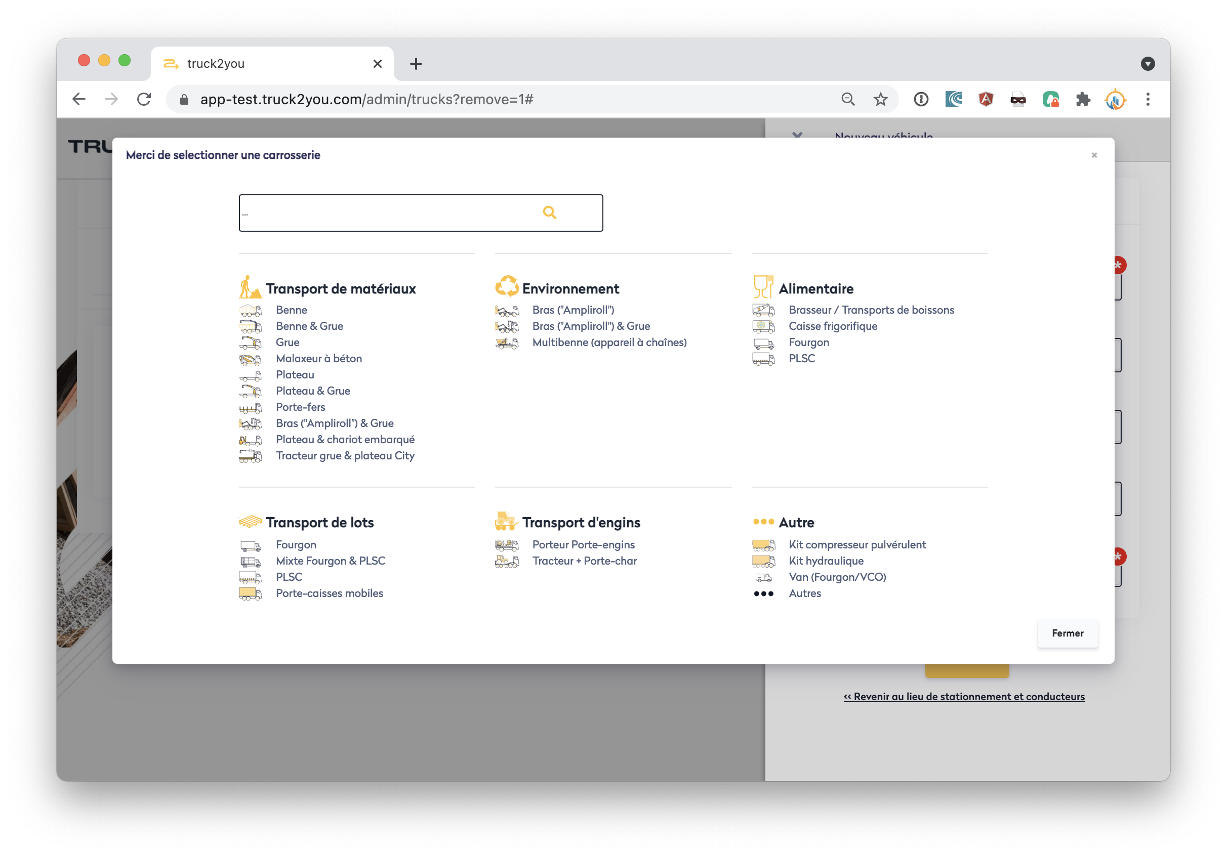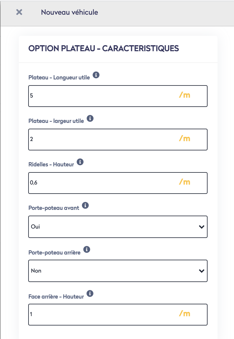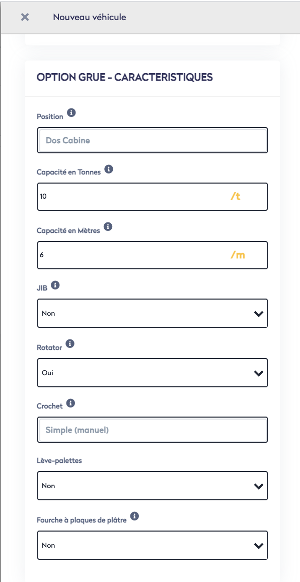 Voici un exemple pour un véhicule "Plateau / Grue" qui a 2 options (option plateau, option grue) :