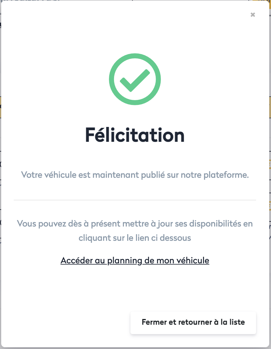 Si votre saisie est complet, le véhicule sera ajouté en mode "publié" : il sera proposé dans vos offres en fonction de vos disponibilités.