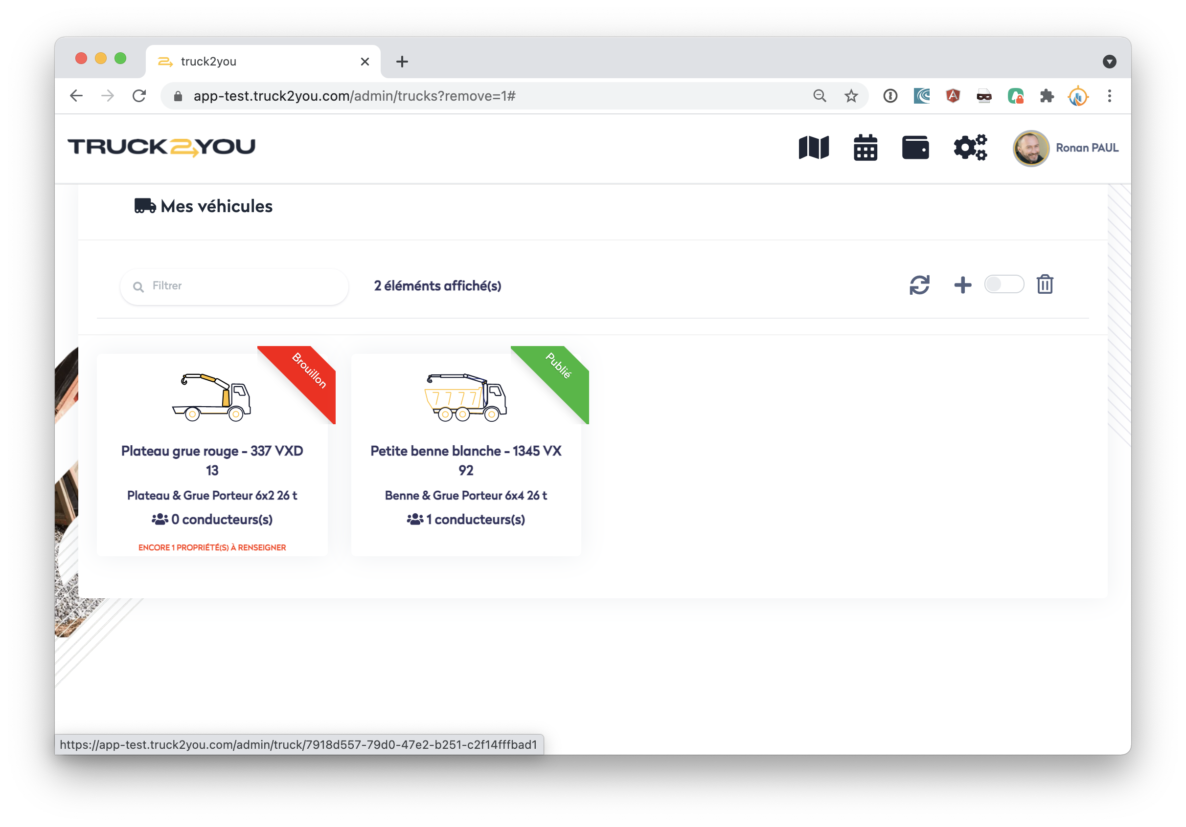Votre véhicule apparaît dans la liste des véhicules, avec un bandeau "brouillon" :