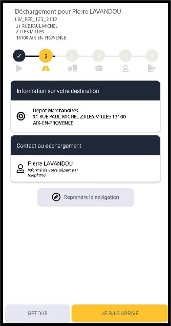 Il sera nécessaire de signaler votre arrivée sur le site, dans l’application, en cliquant sur « Je suis arrivé » afin de passer à l’étape suivante : détail de la marchandise à décharger.