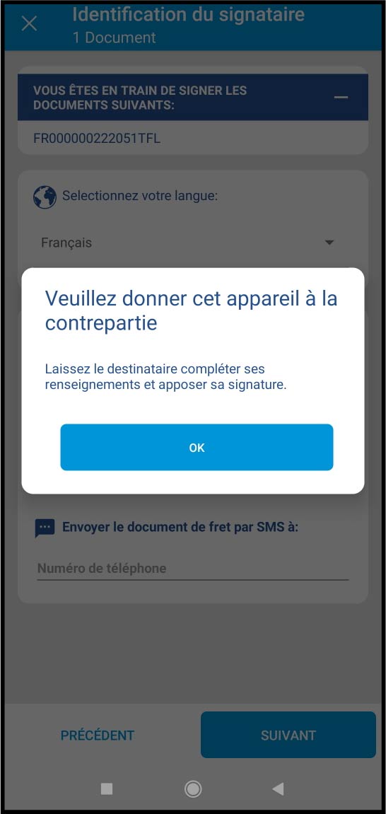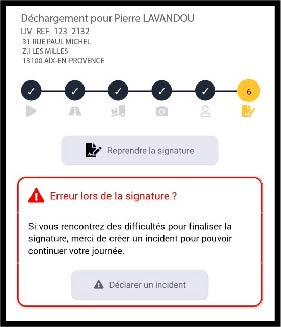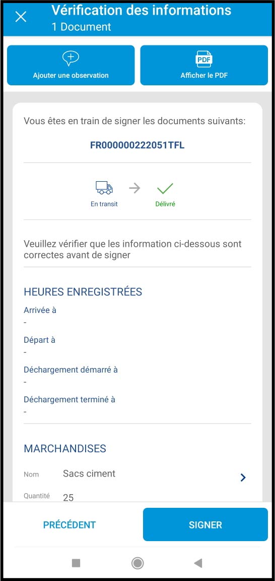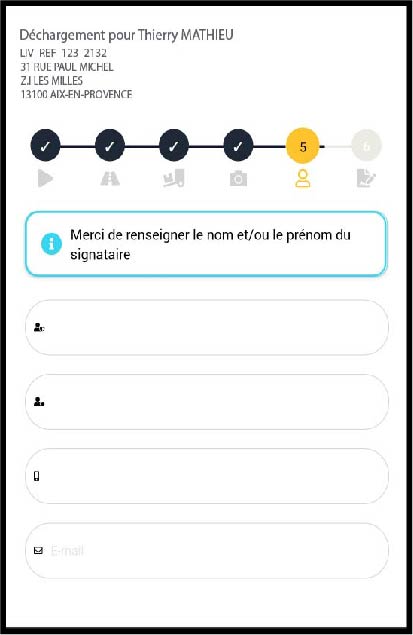 Pour confirmer le déchargement de la livraison, il est nécéssaire d'identifier un signataire dans l’application, et son contact.