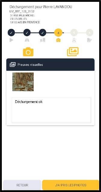 Pour valider le déchargement, il faut prendre une preuve visuelle du déchargement. Une zone de commentaire libre est prévue pour saisir une remarque.