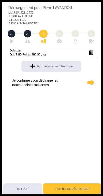 Lorsque l’ensemble de la marchandise à décharger est saisie, confirmer avoir déchargé celles-ci pour pouvoir sélectionner « j’ai fini de décharger » et passer à l’étape suivante.