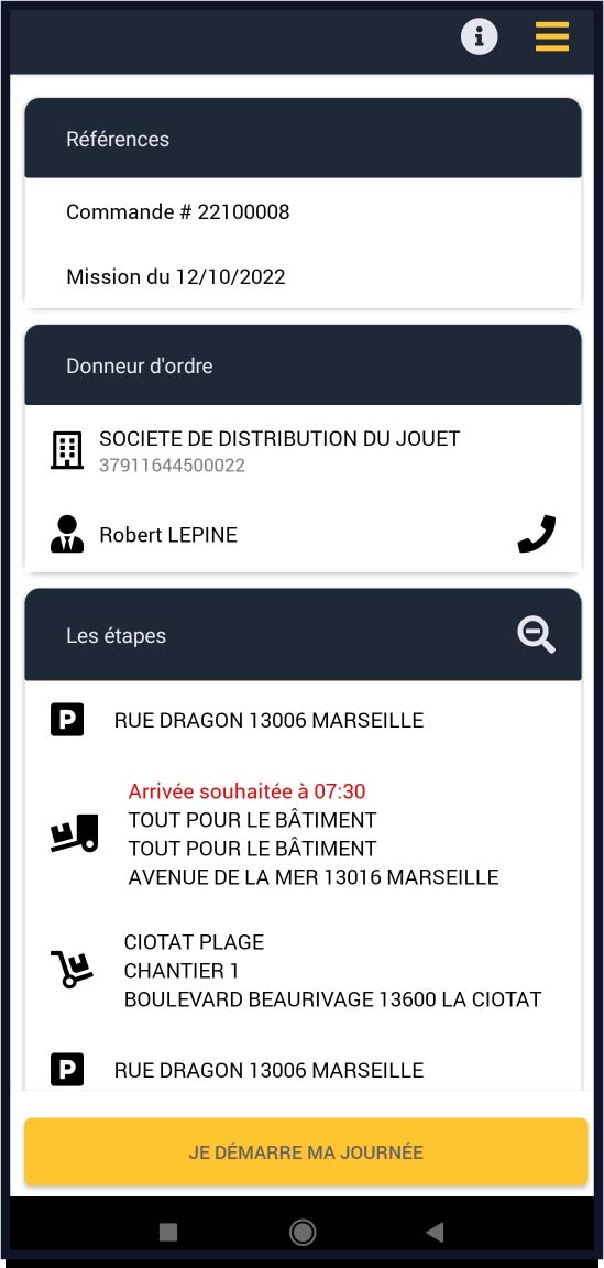 Le matin de la mission, à l'ouverture de l'application, le récapitulatif des informations liées à la mission est affiché. Pour se rendre sur le lieu de chargement, cliquer sur
