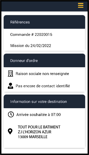 L’application Truck2You ouverte, les détails de la mission sont listés.