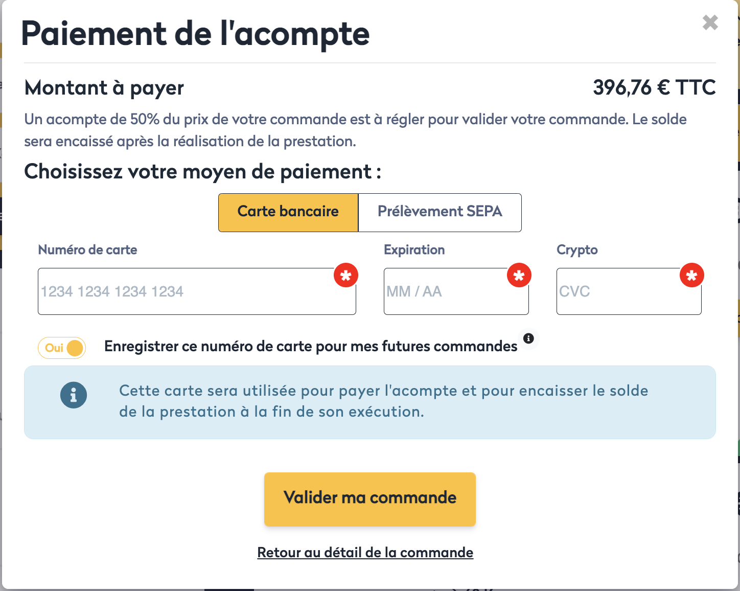 Si c'est votre première commande, vous allez devoir choisir un mode de paiement :
