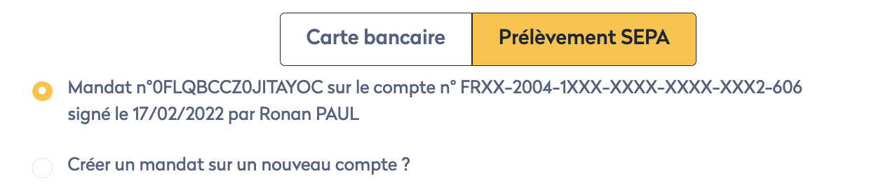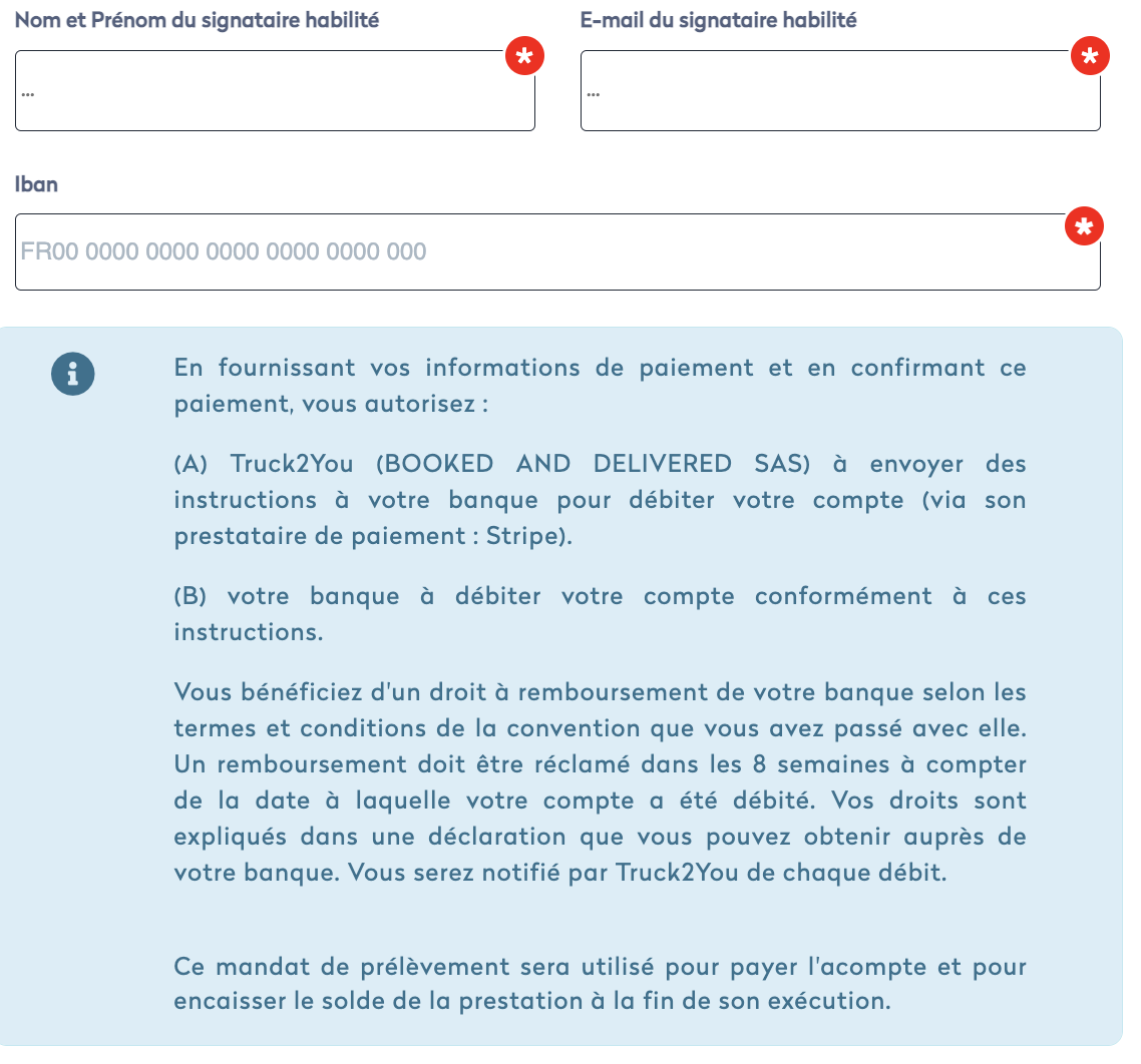 Remplissez les champs permettant de valider le mandat de prélèvement et notamment votre IBAN, le nom et l'e-mail d'un signataire habilité :