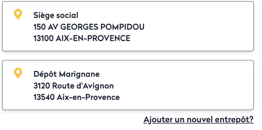 - Entrepôts : liste des entrepôts que vous avez créé dans votre carnet d'adresse