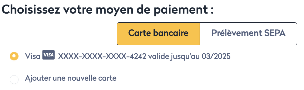 Si vous avez déjà passé commande, ou déjà ajouté un moyen de paiement, la page de commande vous propose le moyen de paiement existant :