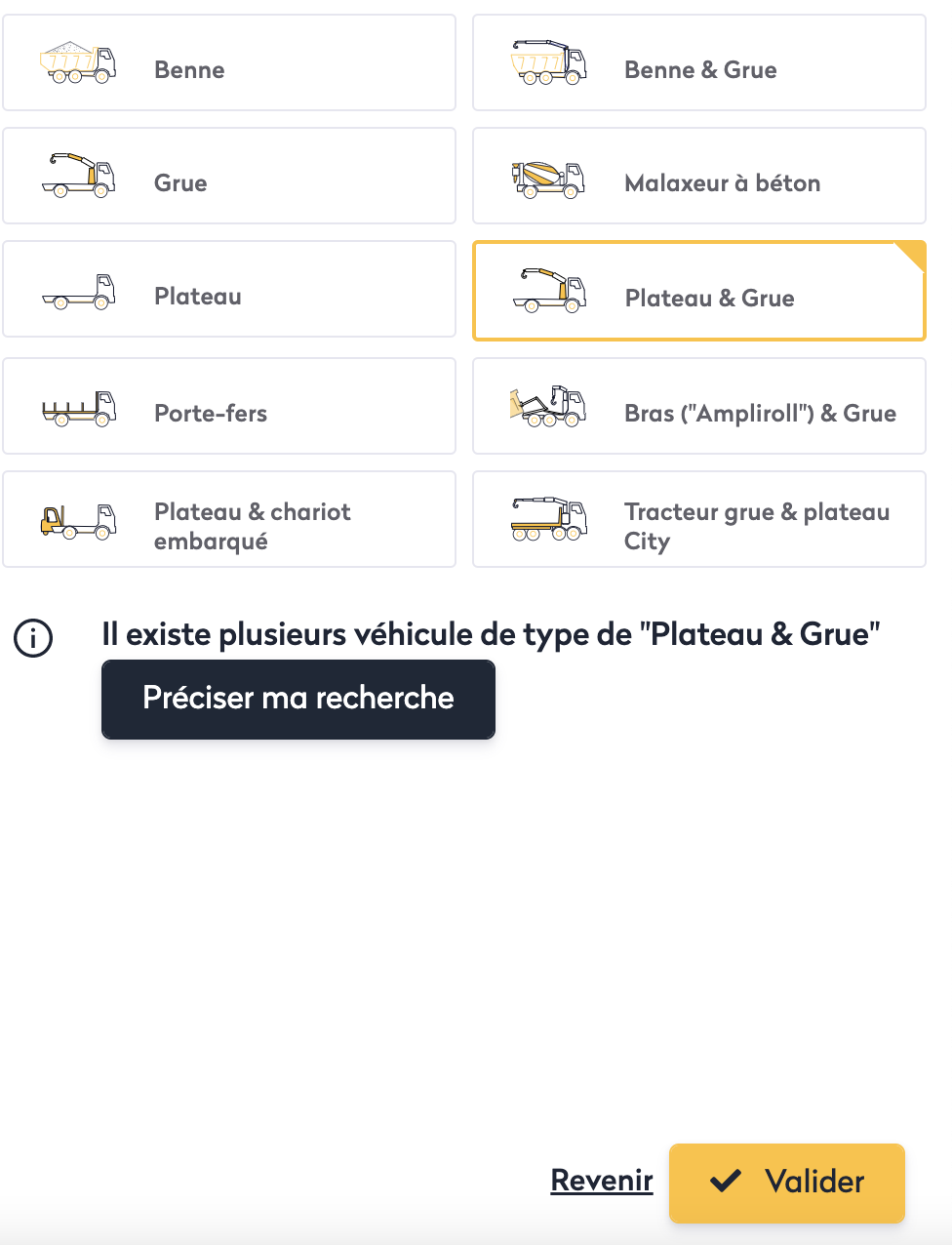 Il est également possible de préciser le type de véhicule en cliquant sur le bouton "Préciser ma recherche" qui va alors proposer des options :