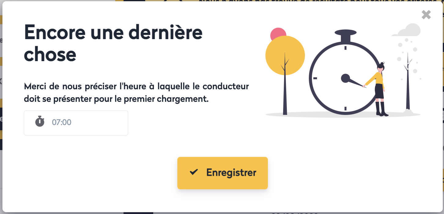 En fin de parcours, vous devrez indiquer à quelle heure le conducteur doit se présenter au 1er point de chargement :