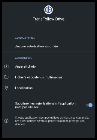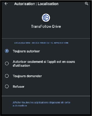 Pour accorder les autorisations de partage d'éléments tels que la géolocalisation, la signature et les médias, rendez-vous dans le menu du smartphone et maintenir le doig sur le logo de l'application Transfollow Drive :