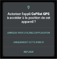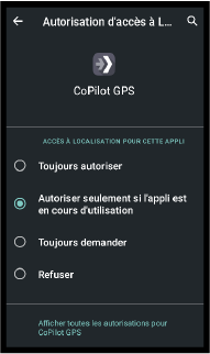 - Et sélectionner "Autoriser seulement si l'appli est en cours d'utilisation", pour permettre à CoPilot d'utiliser les autorisations lorsque l'appli est lancée. Retour avec la flèche en haut à gauche, afin de finaliser la mise en place de Copilot GPS.