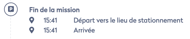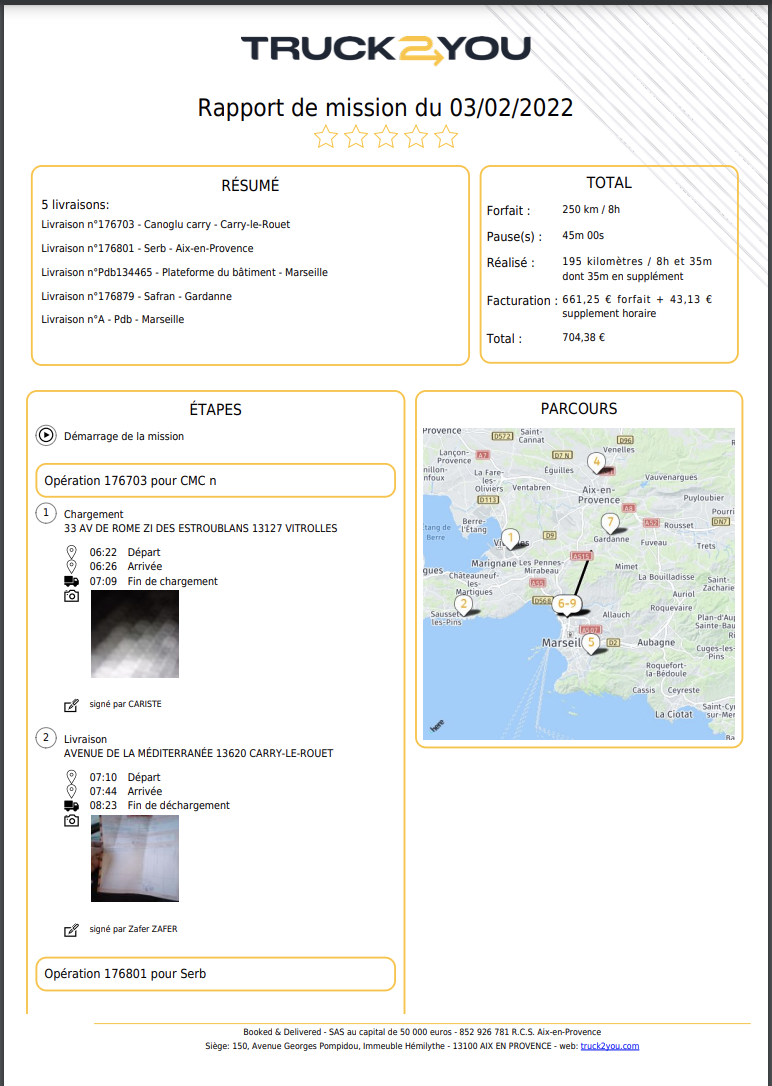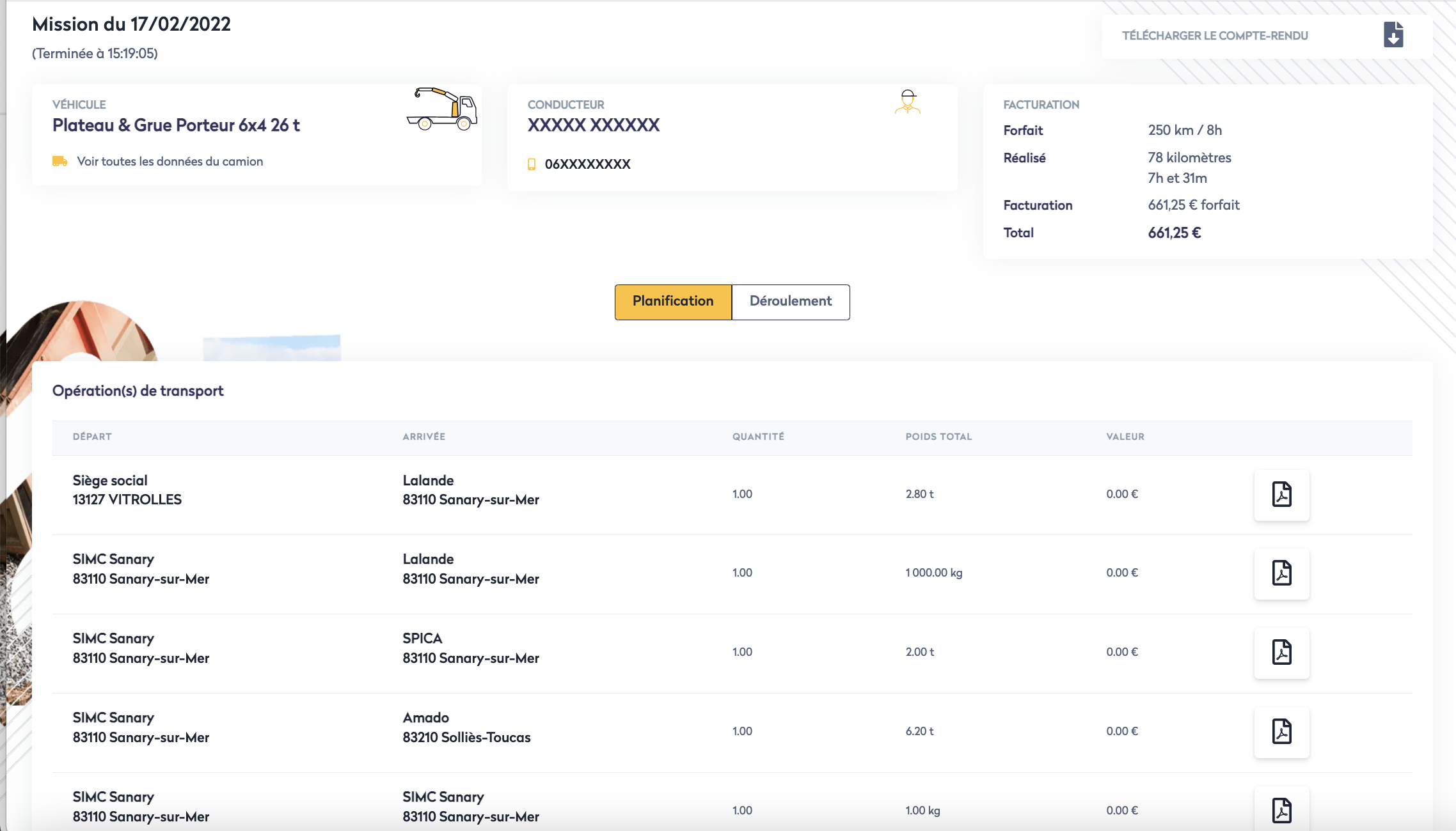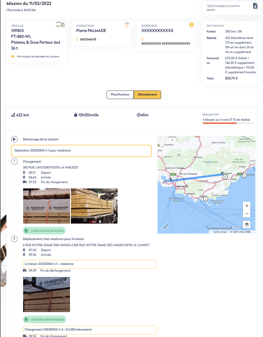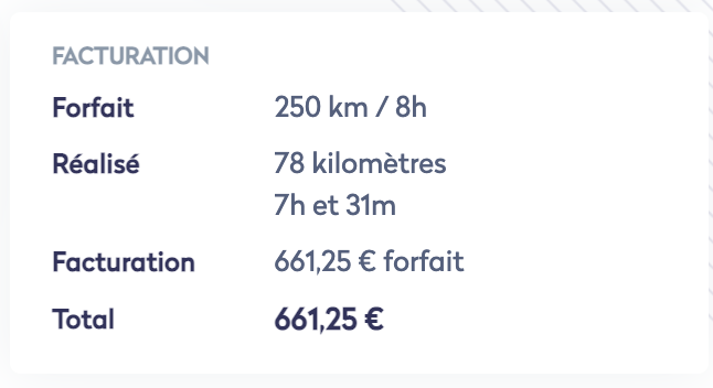 - Bloc "facturation" : résumé de la mission en kilomètres et temps de travail effectif du conducteur, et vision financière