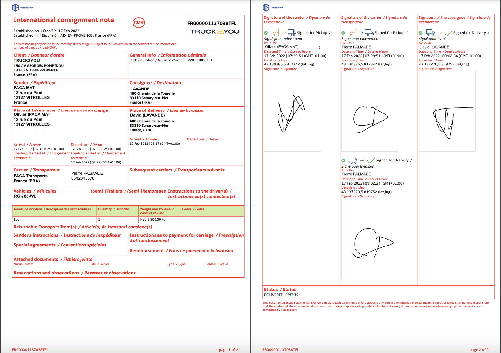 Dès qu'une opération de transport est réalisée, il est possible de télécharger la