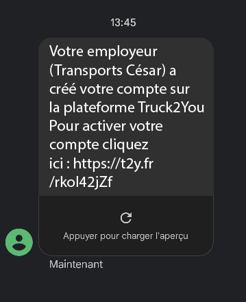 4. Votre conducteur va alors recevoir un SMS l'invitant à valider son compte :