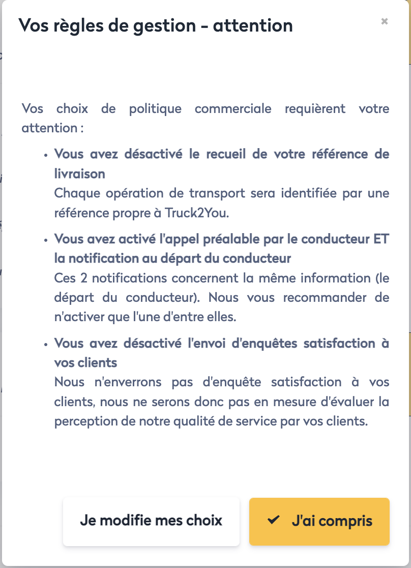 Lors de la validation de vos règles commerciales, vous serez éventuellement alerté sur certains choix structurants :