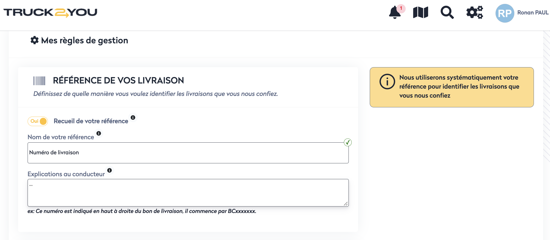 Commencez par indiquer si vous souhaitez que nous utilisons votre référence de livraison : si ce champ est actif, le conducteur devra obligatoirement saisir cette référence.