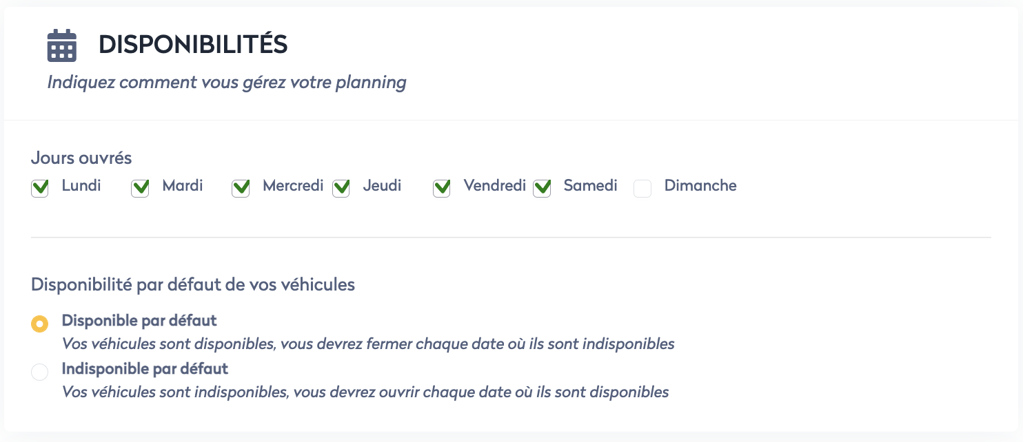 ➡ Vous devrez ouvrir vos disponibilités dans le planning pour qu'elles soient proposées sur la plate-forme - disponible par défaut : tous vos véhicules seront considérés comme disponibles.