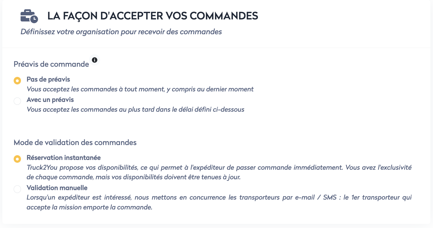 - Le mode « Réservation instantanée » permet à l'expéditeur qui fait une recherche de souscrire directement ; c’est le mode recommandé car il correspond le mieux à l’attente des expéditeurs. Ce mode nécessite que vous teniez à jour votre planning de disponibilité.