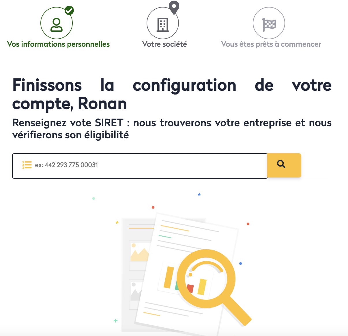 - Une fenêtre vous invite à renseigner le SIRET de votre société :